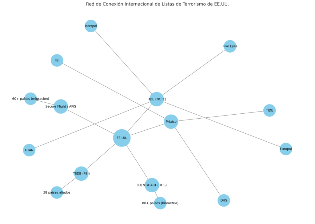 Estados Unidos mantiene una red global de vigilancia contra el terrorismo que se extiende a más de 80 países mediante bases de datos compartidas, acuerdos bilaterales y plataformas biométricas. México forma parte de este engranaje internacional, con impactos directos en sus políticas migratorias, de seguridad nacional y derechos humanos.