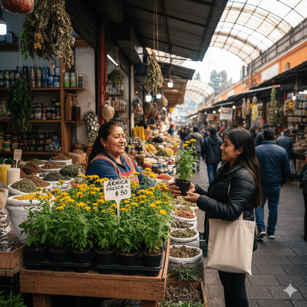 Capitalinos adquieren árnica fresca en el Mercado de Coyoacán para infusiones invernales; la planta se vende desde 50 pesos cerca del Metro.