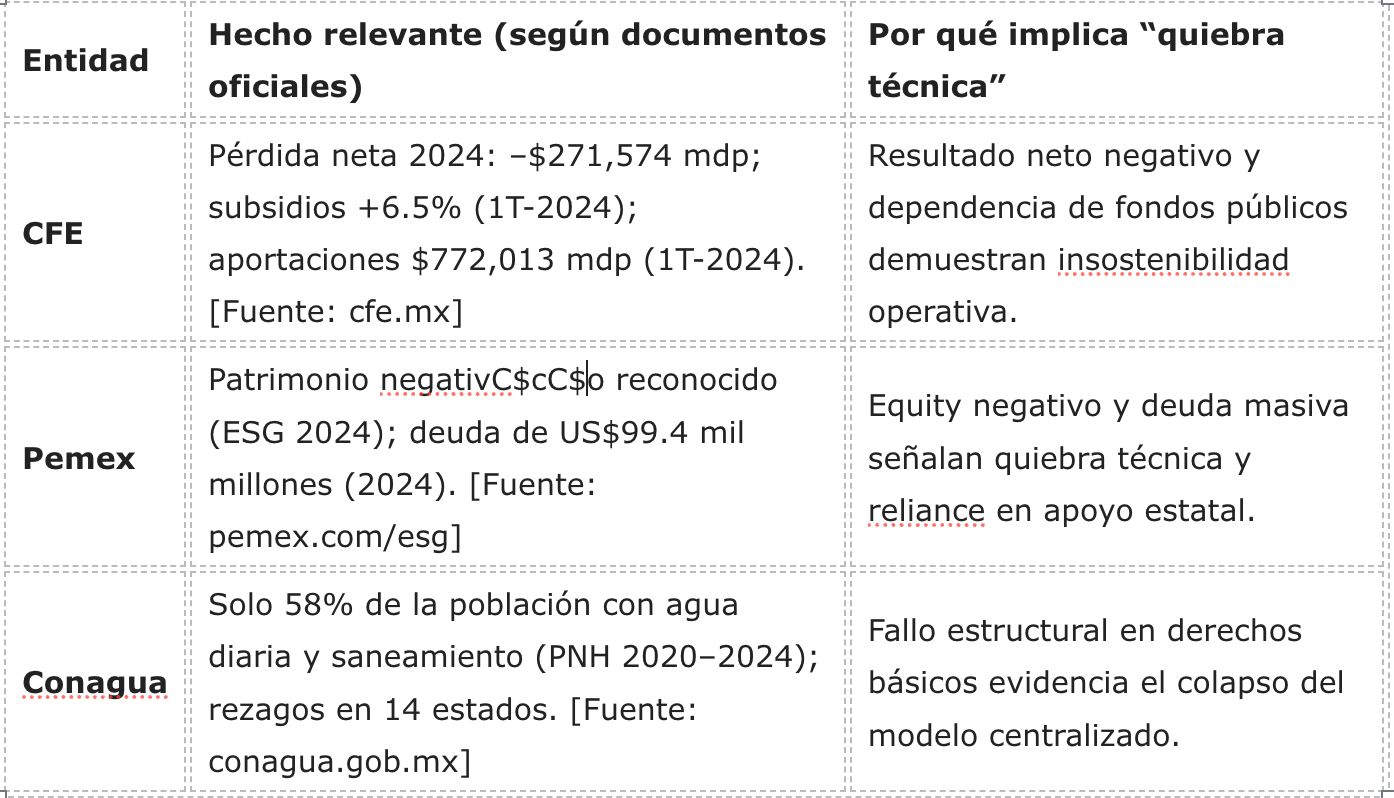 Los números oficiales confirman la realidad: CFE acumula pérdidas y depende de subsidios; Pemex opera con deuda y patrimonio negativo; Conagua admite rezagos persistentes.