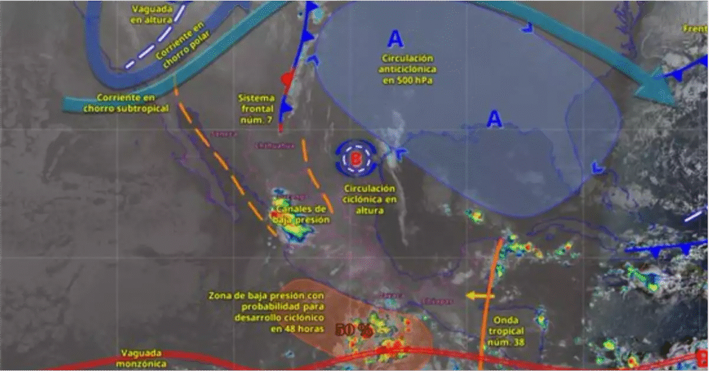 Según el último reporte de la Comisión Nacional del Agua (Conagua), la zona de baja presión se localizó a 405 kilómetros al sur de Puerto Ángel, Oaxaca, y tiene 50% de probabilidad de desarrollo ciclónico en 48 horas y 60% en siete días. Los meteorólogos prevén que el sistema gane fuerza hacia el fin de semana, impulsado por las altas temperaturas oceánicas del Pacífico Sur.