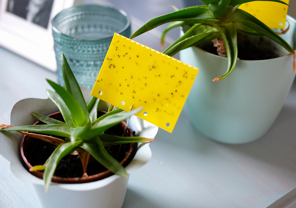 Para atrapar a los adultos, puedes usar trampas caseras, como una cartulina amarilla untada con miel, colocada cerca de las macetas. Las mosquitas se sienten atraídas por el color y quedan pegadas, ayudando a disminuir la población reproductiva.