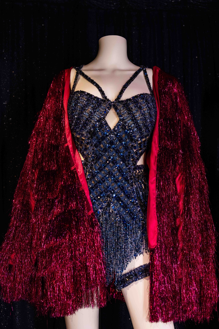 Se trata de un bodysuit azul medianoche, cubierto de cristales y cortes laterales, acompañado de una chamarra de flecos multicolor que Taylor Swift utiliza durante la interpretación de “Karma”.