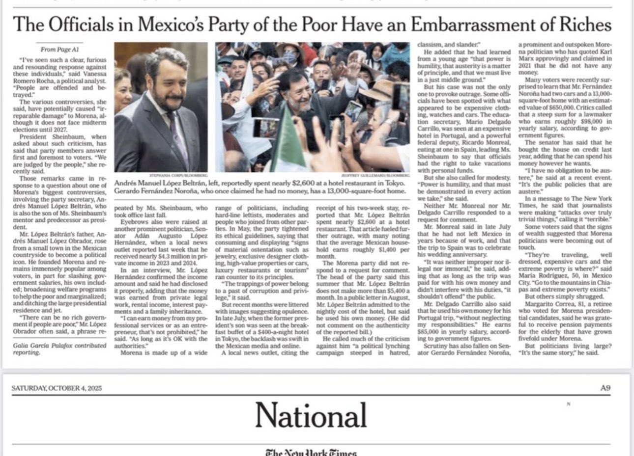 Ándele, que cuando parecía que la bandera de Morena contra la corrupción ondeaba sin mancha alguna, llegaron los del New York Times a aguar la fiesta. Resulta que el famosísimo diario gringo, ni más ni menos, se puso a investigar y publicó una serie de reportajes que le están sacando canas verdes al partido en el poder, pues dejan ver que no todo lo que brilla es oro en la llamada «Cuarta Transformación». La cosa es que están exponiendo unos escándalos y un doble discurso que nomás no checan con su promesa de ser diferentes.