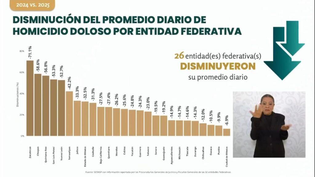 Por segundo año consecutivo, Zacatecas se posiciona como el estado más seguro de México, de acuerdo con datos oficiales del Secretariado Ejecutivo del Sistema Nacional de Seguridad Pública (SESNSP). La entidad registró una disminución histórica del 71.1 por ciento en homicidios dolosos entre 2024 y 2025, un resultado que coloca al estado a la cabeza de las 26 entidades federativas que lograron reducir su promedio diario de este delito en dicho periodo.